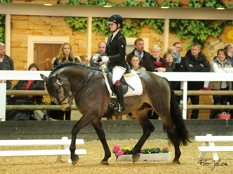 Er wurde mit Eldorado Rock und Sternbergs Like Me in der Gruppe der jüngeren Hengste unter dem Sattel vorgestellt. Ihm hätte man mehr Elastizität und Anlehnung gewünscht, insgesamt eine etwas schwunglose, aber ganz korrekt gerittene Vorstellung. Die Noten dafür 6,5, 7,0, 6,5, 6,5 und gesamt die 6,63. Der Eindruck beim Freispringen war sicherlich, dass man ihm eine bessere Vorderbeintechnik und mehr Rückentätigkeit wünschen würde, andererseits zeigte er viel Vermögen und eine positive Einstellung. Die Noten in dieser Disziplin waren 7,5, 7,2 und 7,4, insgesamt 7,37. Bei der Vorstellung an der Hand wurde er leider in starker Außenstellung vorgetrabt, so dass seine Oberlinie nicht zum Schwingen kommen konnte und eine freie Bewegungsentfaltung gehemmt war. Die nun durchgängig vergebene Note 7,0 bildete auch die Endnote.